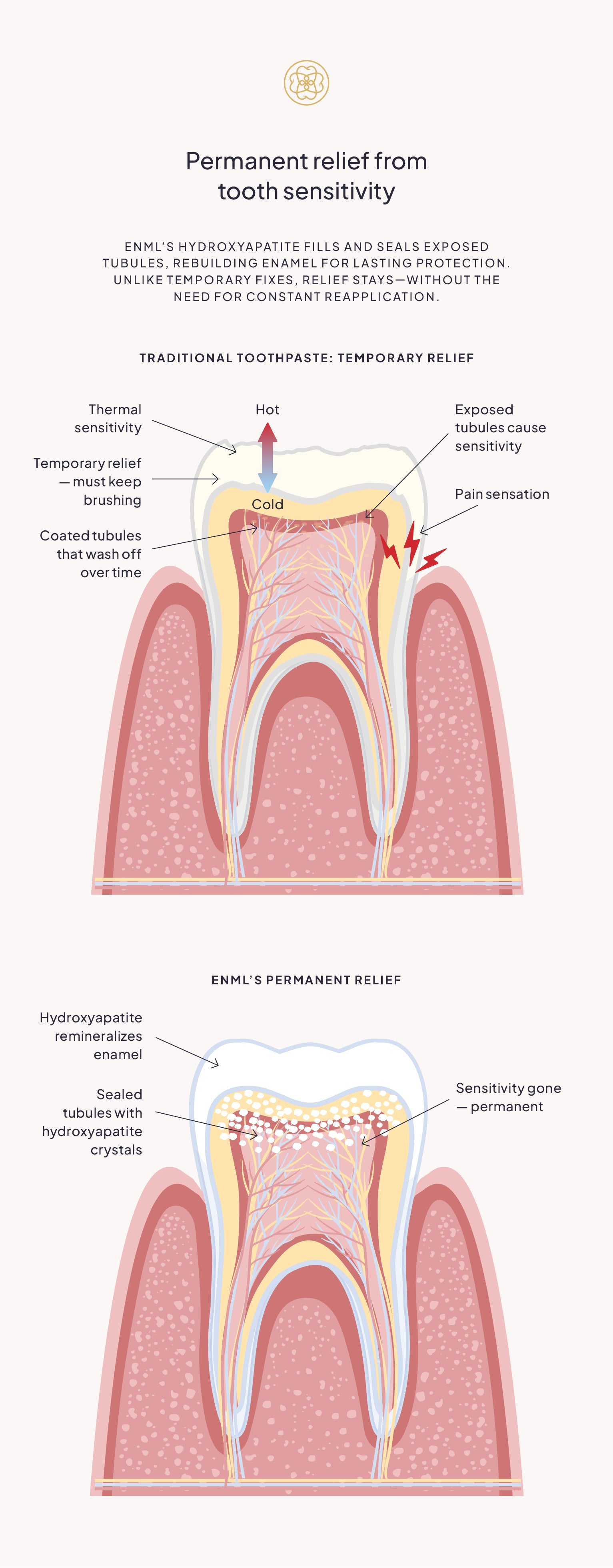 Hydroxyapatite (especially micro-hydroxyapatite in ENML tablets) works by sealing these open tubules: These particles deposit on the tooth surface, fill microscopic defects, and remineralize enamel, creating a protective layer that blocks fluid flow and reduces pain. This process not only provides fast relief but also strengthens enamel long-term, preventing further sensitivity.